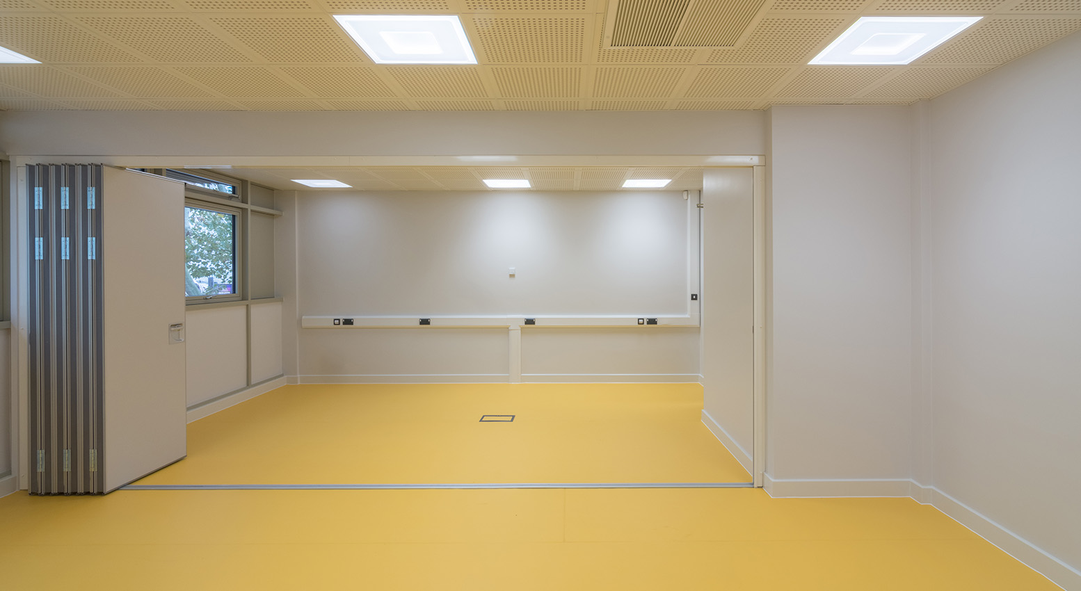 The new day centre spans across two floors, with the ground floor featuring various activity rooms such as a training kitchen, gym, hairdressing room, and a large versatile central space. The first floor contains bookable rooms and activity spaces available for a variety of uses, along with a recording studio. The building also features a terrace area around its perimeter.