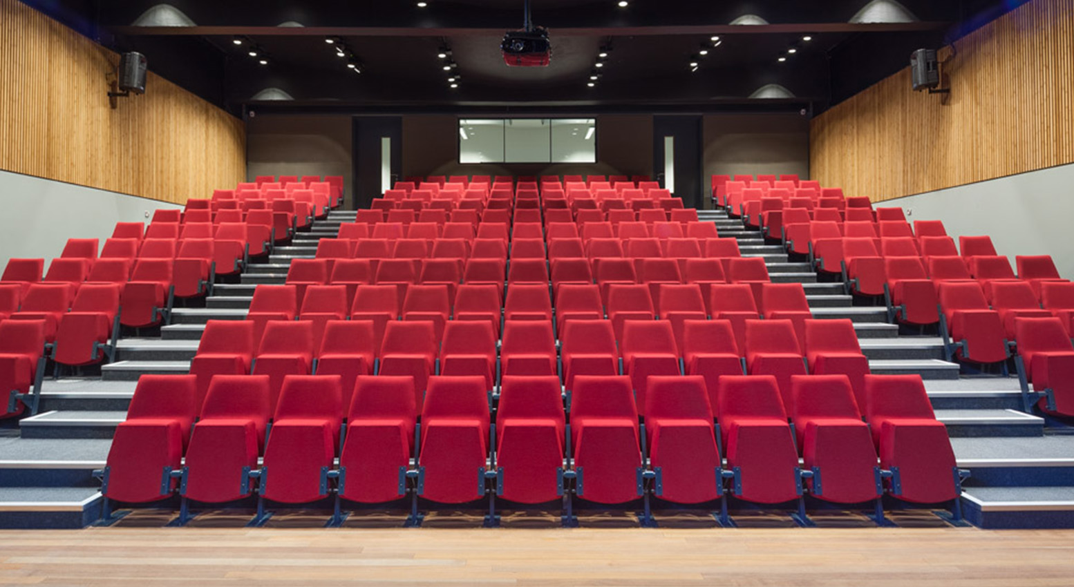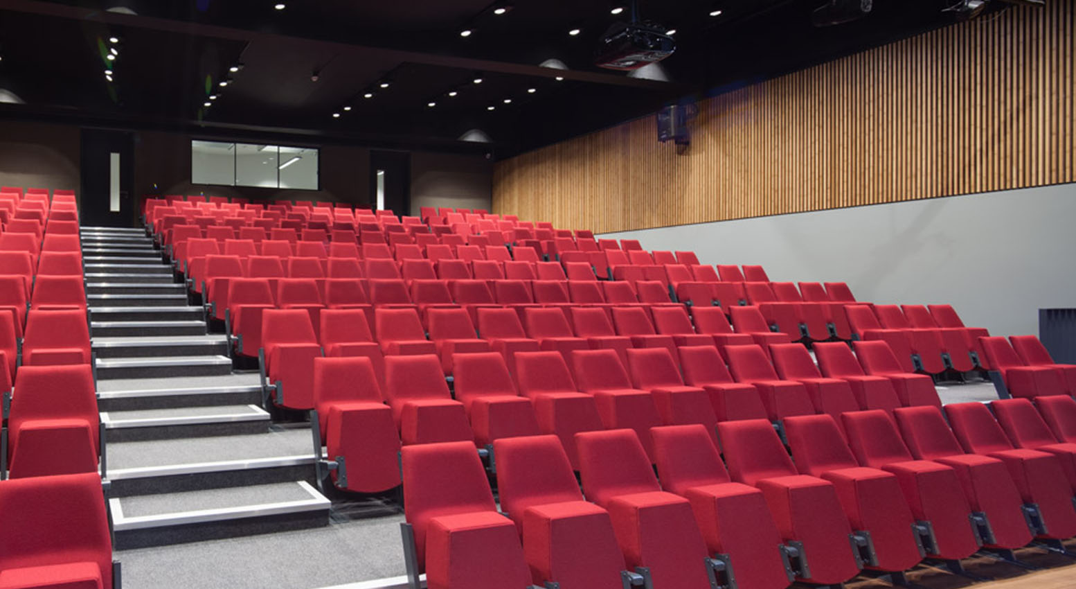 The tiered seating was built on site and formed around a large air handling unit with extensive acoustic housing. This ensured sufficient heating and cooling to the 206no.seat theatre without jeopardising the theatre ambience. Specialist contractors were engaged to install AV systems, control room equipment and theatre curtains.